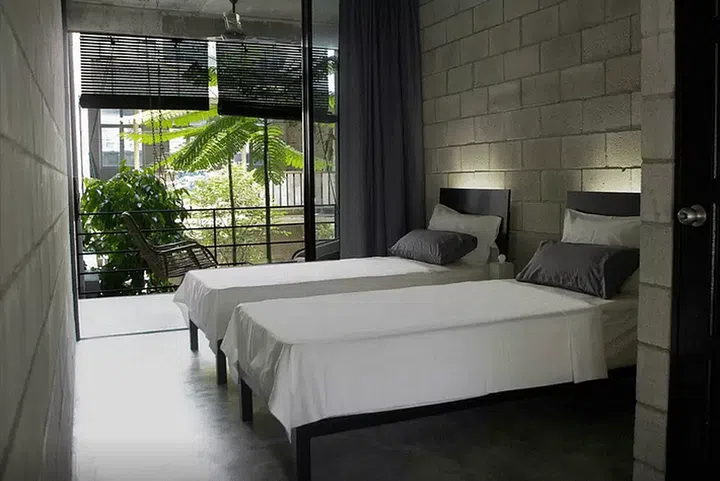 The Courtyard House is a simple, no-frills space that focuses on two things - greenery and concrete. There's also a pool for you to have a nice long soak!