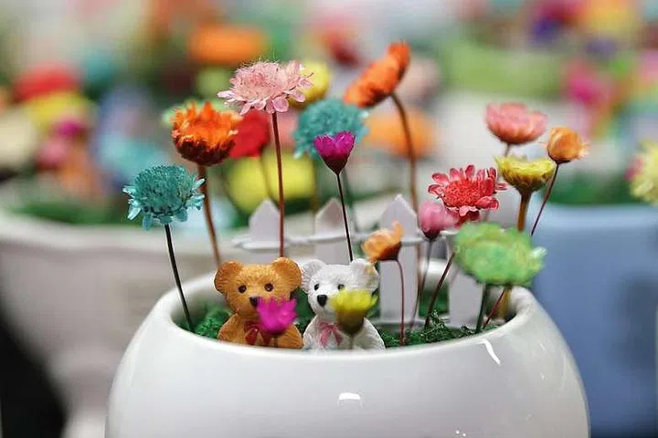At the stall Freezy Flower, the dainty flora sits alongside adorable figurines of iconic cartoon characters such as Hello Kitty and Doraemon.