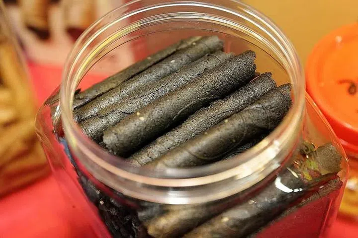 At Noelle Grandma's Cookies, the black charcoal love letters stand out in a sea of light brown cookies. The taste is similar to that of regular love letters.
