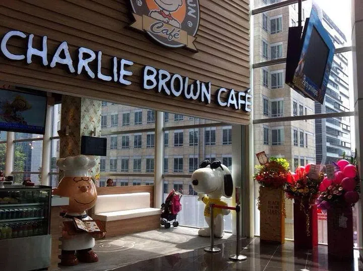 Charlie Brown Cafe is South-east Asia's first Peanuts comic strip themed-cafe. The first outlet in Orchard Cineleisure Mall opened in 2011, followed by the OneKM mall in 2015. Both cafes are Halal-certified.