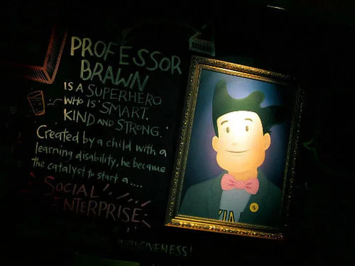 They decided on the name of the cafe after he saw his then 12-year-old son Jun-Yi's drawing of a scholarly superhero, Professor Brawn. Jun-Yi, who is autistic, described the superhero as "strong, smart and kind", and Mr Tay wanted the cafe to embody these characteristics.