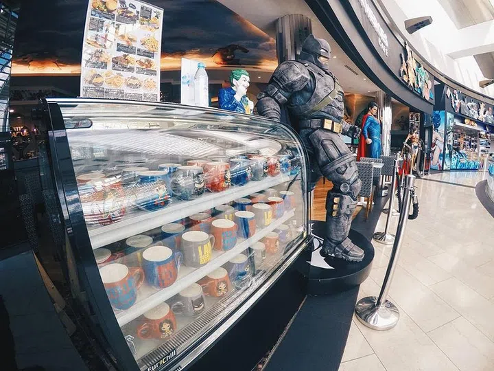 The cafe is decorated with posters from the DC Comics series, a life-sized figure of Superman breaking through the wall, limited-edition merchandise and a life-sized replica of the Batmobile.