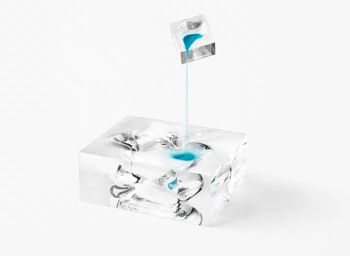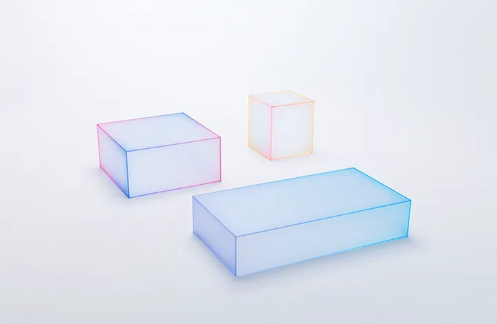 The frosted glass low tables in the shape of boxes feature joints printed in bright colours with a gradation effect, as well as edges that give a soft, blurry appearance – contrary to the usual image of glass.