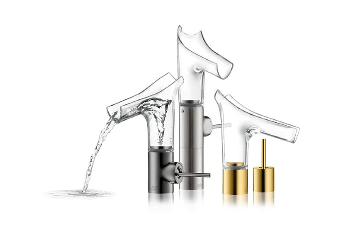 The vortex phenomenon is a fascinating thing to watch, and “it’s a pity we’ve never been able to see the water in the mixer”, says Klaus Grohe, son of the Hansgrohe founder. Axor Starck V fills this gap with a clear crystal glass that reveals the rush of water to the spout. This sophisticated design by Philippe Starck also belies a functionality you would not have expected; the dirt- and scratch-resistant glass body is removable (without the need to close the valve), dishwasher-safe, and can easily be clicked into place. Twelve finishes, such as brushed nickel for the base, are available.