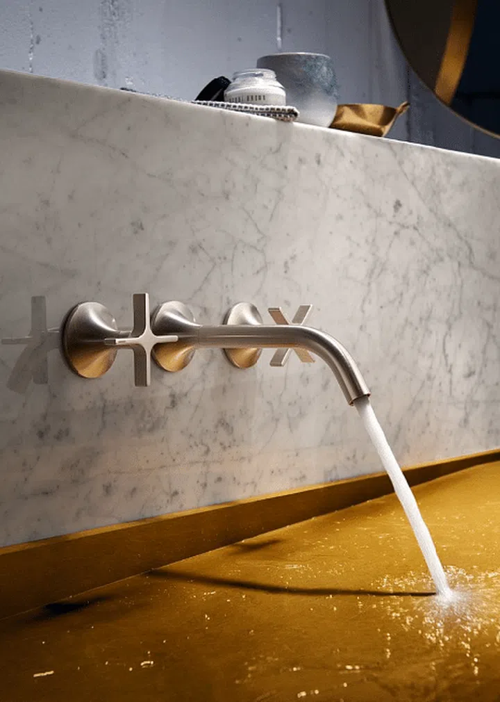 Years of working with top architects and interior designers have led Dornbracht to attempt to physically capture an evergreen look: The fusion of old and new. The Vaia Platinum strikes a balance by packaging delicate, traditional spouts in a softer, sleeker contour, as well as giving the traditional cross handles a geometric, angular form. This way, Vaia will look right at home in a classical-style powder room, as well as a contemporary bathroom – and, of course, in an eclectic space that mixes the two.