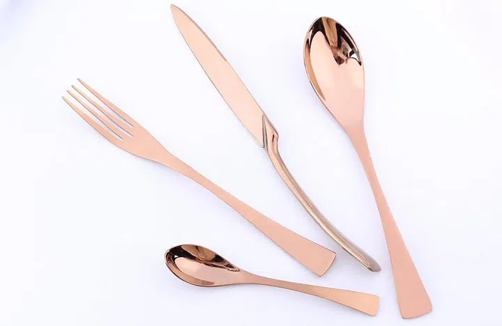 Durable and stylish, this rose gold cutlery set would be a stunning addition to the dinner table.