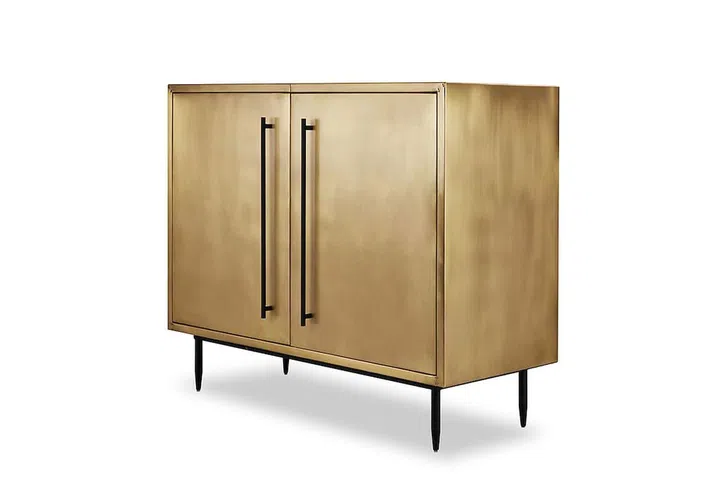 Living Cabinet of Soldier Brass Exterior with Smooth Jet Black Handles and Legs, Oak Loft Distressed Solid Wood Wine Rack Inside