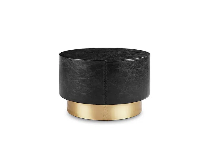 Round Coffee Table of Soldier Brass Base and Texan Light Brown Leather Top with Leather Belt Handstitching Detail