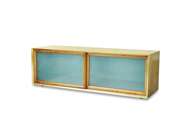 Oak Loft Natural Wood Frame, Soldier Brass Cabinet with Adjustable Safety Glass