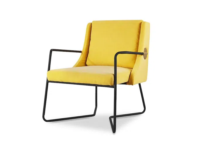 Chair of Texan light brown Leather Cushion and Smooth Jet Black Steel Frame with Brass Plated Polished Accents