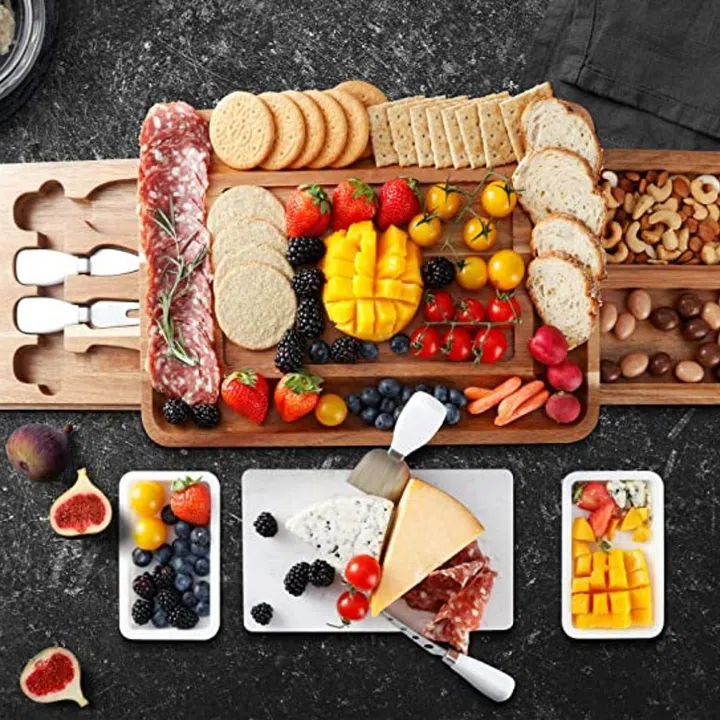 The ultimate crowd-pleaser and a host’s lifesaver. Preparing a cheese and charcuterie board is an easy way to entertain guests, before or after a meal. This set is made with acacia hardwood and comes with concealed drawers for cheese knives and snack plates, which are included in the set.