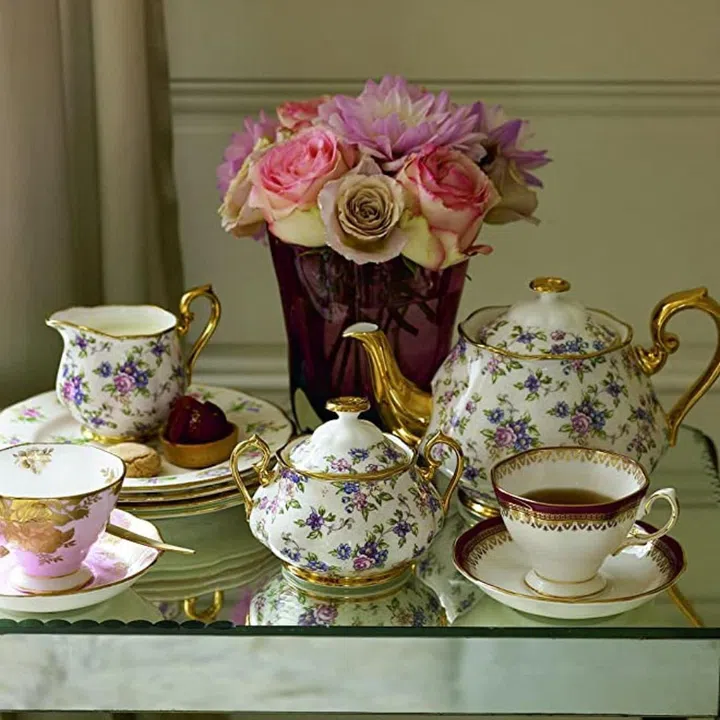 English brand Royal Albert is known for their vintage and heritage tableware. Flowers adorn this 3-piece tea set, which includes a teapot, sugar pot and creamer pot, with 22-carat gold trim. A decadent way to serve your tea.