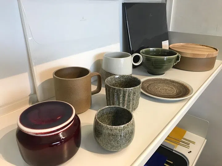 The walls of the shop are also filled with shelves featuring artisanal products, such as these ceramic bowls and Japanese craft scissors. Special mention goes to the crane-shaped scissors!