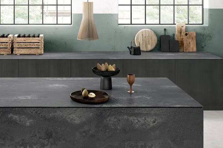 At the opposite end of the spectrum is the 4033 Rugged Concrete. Designed to cater to lovers of unapologetically gritty urban look, this variant features a dark grey finish with a powdery white patina that mimics water stains. This rugged beauty lends an edge to any interiors, as illustrated by the kitchen below.