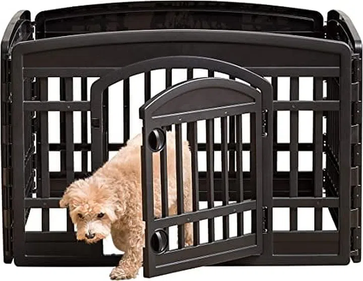 Prepping to welcome your furry bundle into the home? This stylish black playpen will help to keep your pet away from dangerous objects while you're away, and provide a safe and secure corner so it can learn to appreciate its personal space too. The IRIS playpen is portable and provides 8 sq ft of play space for pets. It's also made of durable molded plastic, and add-on panels are available to create larger pet playpen if necessary.