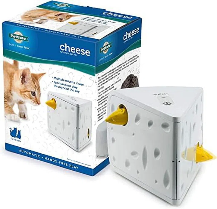 Keep your feline companion entertained for hours with this interactive cheese block! Cats and kittens can keep active as they play peek-a-boo with two mice that dart from either side of the block of cheese. The Cheese cat toy can be set to activate three separate automatic play sessions throughout the day, and turns off automatically after 15 minutes or manually with on/off button.