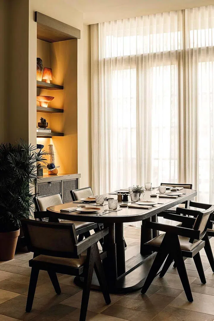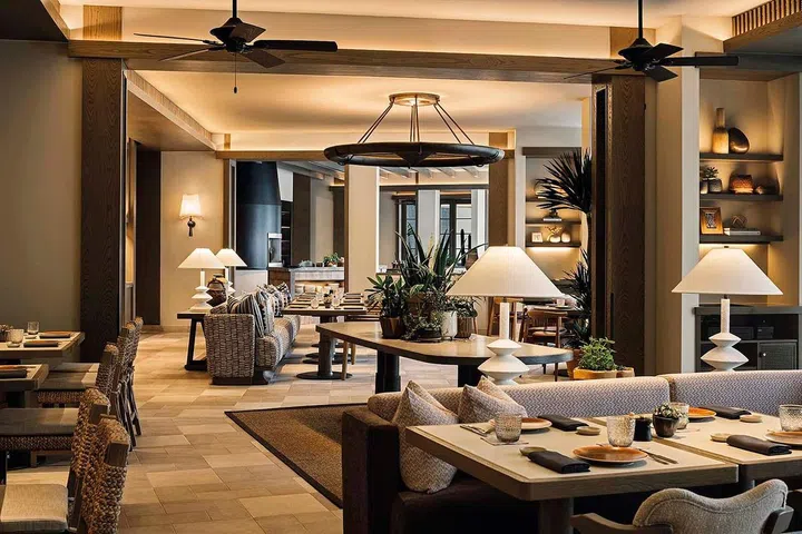 Uniting these diverse seating areas is the restrained colour palette comprising the colours of sand, terracotta, washed oak and dusty aubergine – restrained and yet effective in expressing an rustic yet elevated tropical resort concept.