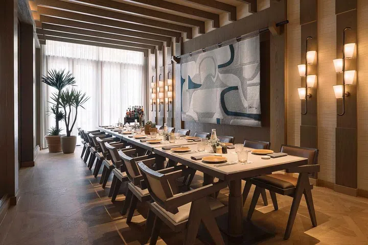 Further into the floor plan is the private dining room that seats 16 pax, featuring timber rafters and mid-century inspired lamps.