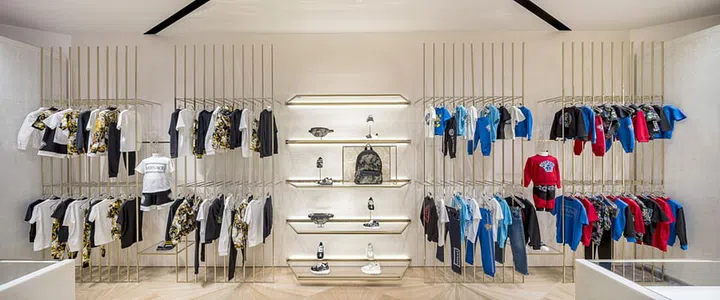 These allow the colours of the clothes to pop and change the overall mood of the store according to the seasons without losing its character.