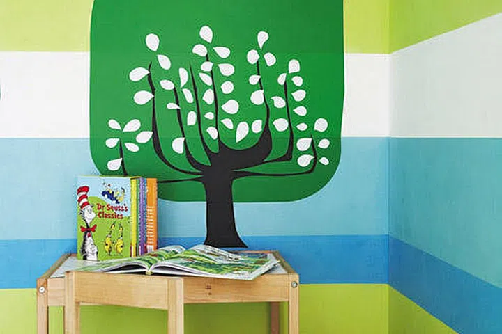 This hand drawn wall decal, designed by the interior designer, could be an art project for your child. Give your kids a chance to participate in decorating parts of their own room. The decal goes well with the striped wall, adding cheer to the little corner.