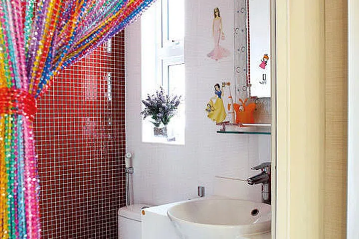 Why let the fun stop at your child’s bedroom? These homeowners put up a rainbow beaded curtain and had their designers lay bright red mosaic in their child’s bathroom.