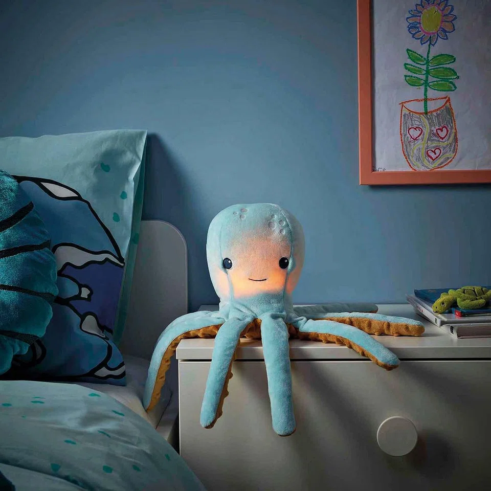 Your cuddly eight-legged friend, BLÅVINGAD octopus soft toy from IKEA is here to keep your child feeling all safe and snug. A gentle press on the octopus’ head illuminates the dark room with a soft whispering glow for the coziest comfort. Thanks to the removable battery-operated lamp, the octopus plushie is safe for your child to play and cuddle with.