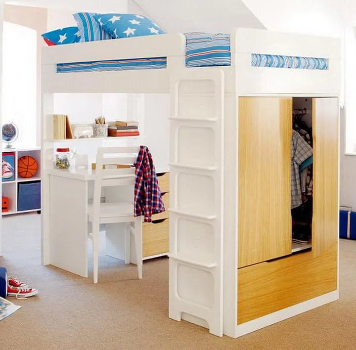 The generous area created under loft beds also allows for a wardrobe to be fitted into the otherwise dead space.