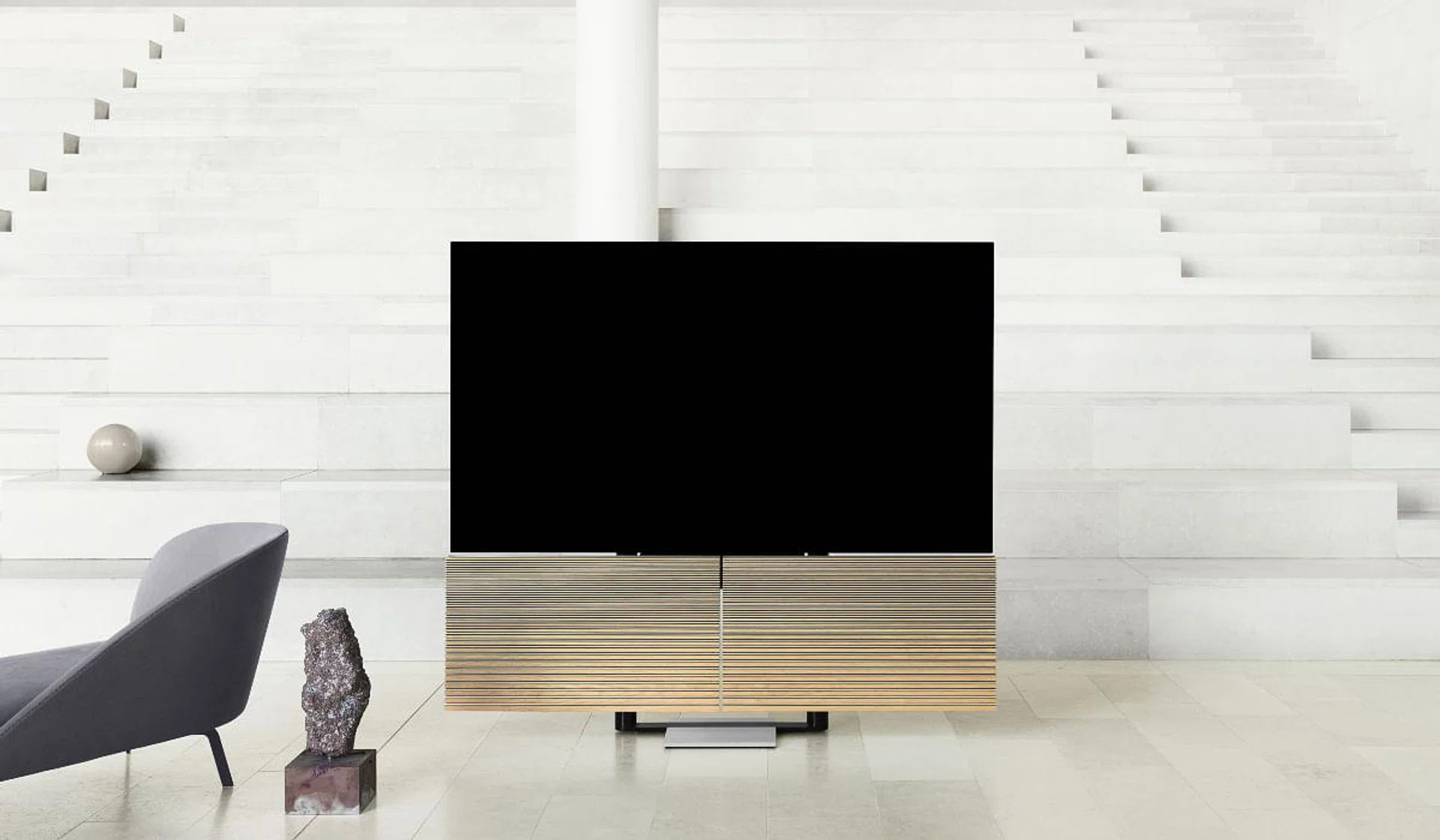 It also features a fully integrated three-channel stereo sound system and dual built-in sub-woofers below the television screen – but it’s also completely compatible with Bang & Olufsen’s speaker programme, so you could theoretically connect up to eight wireless Beolab speakers for an awesome 7.1 surround sound viewing experience. The wooden speaker covers are also graded to maximise acoustic performance.