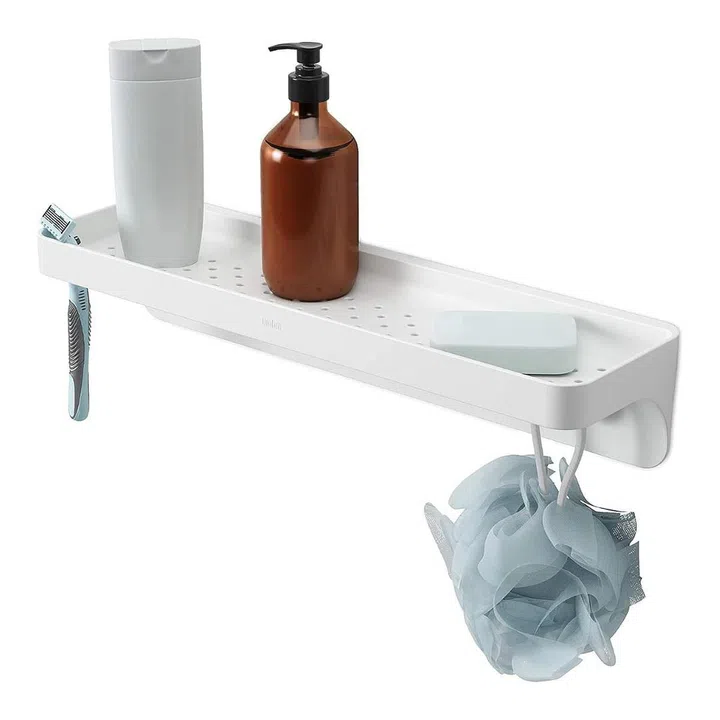These adhesive white floating shelves offer a sleek storage solution without the fuss of drilling. Perfect for bathrooms, these lightweight, waterproof shelves efficiently house shower essentials, skincare, phone or portable speaker at up to 6kg.