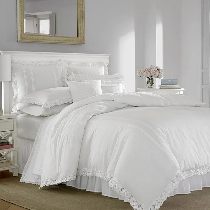 The design features white on white cool, crisp cotton trimmed with crocheted lace, adding a romantic and modern feminine touch. The duvet cover is also reversible to a coordinating pattern, allowing for two different looks.