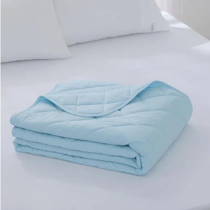 Featuring a special Japanese Q-Max 0.4 Arc-Chill Cooling Fibers, this blanket is designed to keep you cool and comfortable even when the weather outside is heating up. The top layer features a cooling yarn that transfers moisture from the skin to the surface of the fabric so it quickly evaporates, while the 100 percent cotton on the inside still keeps you comfortable.