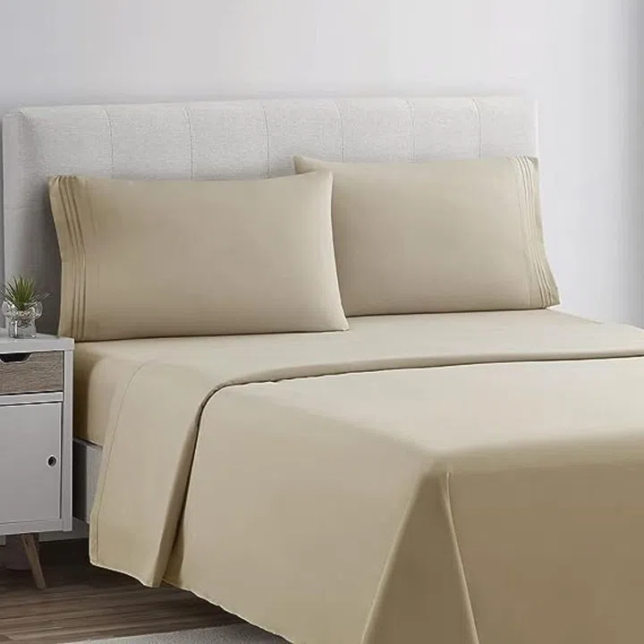 Designed for queen-size beds, this 4-piece set includes a flat sheet, fitted sheet, and two pillowcases in a beautiful beige cream colour that complements many interior design themes.