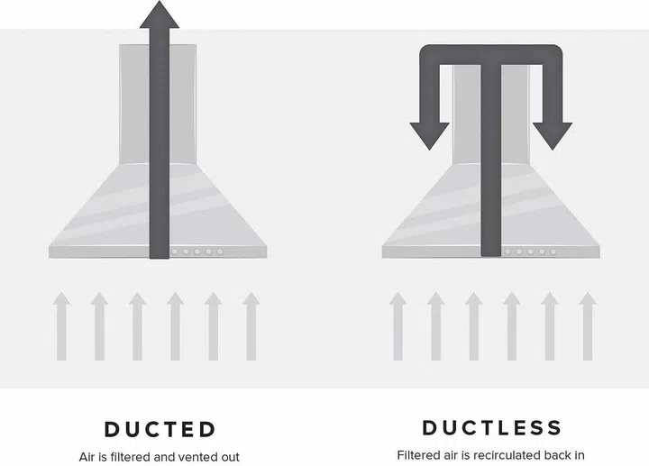 Recycling hoods, also known as ductless hoods, are the standard kitchen hoods used in apartments as they filter out oil and grease in smoke and steam, removing odours before recirculating clean air in your kitchen, while a ventilation hood or a ducted hood has additional ductwork installed to push the fumes out of the unit.