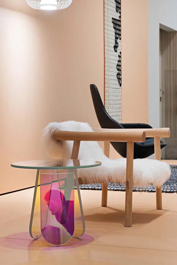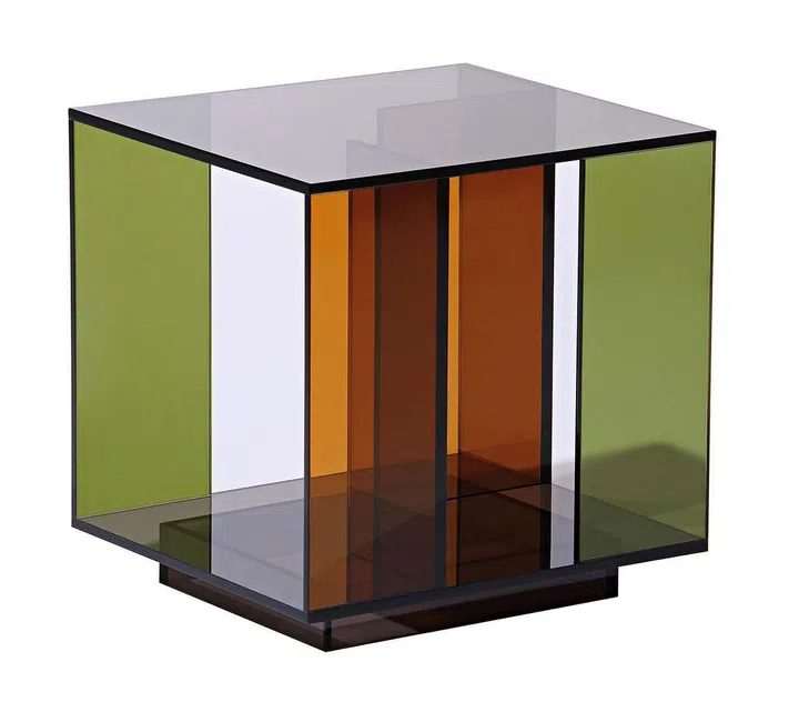 Designed by the Spanish designer Patricia Urquiola, this side table is made of laminated glass glued together, and can be fully dismantled for easy storage and moving. The glass is coated with a special iridescent multi-chromatic finish that casts vibrant colours with light.
