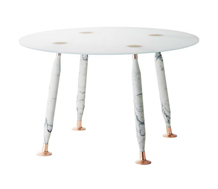 The tabletop is made of transparent, laminated, or smoked tempered glass. The cylindrical legs are made of Nero Marquina or Arabasque veined marble, and tapers into gold, rose copper, bronze, nickel, or aluminum hardware.