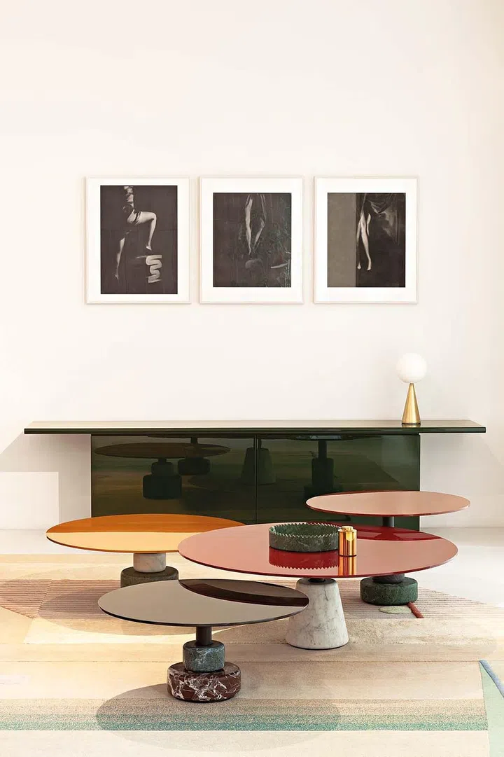 Designed in 2021 by Mist-o, the Italian Living Divani Moon series of low and wide side tables, coffee tables, and storage cylinders make a graceful set to behold.