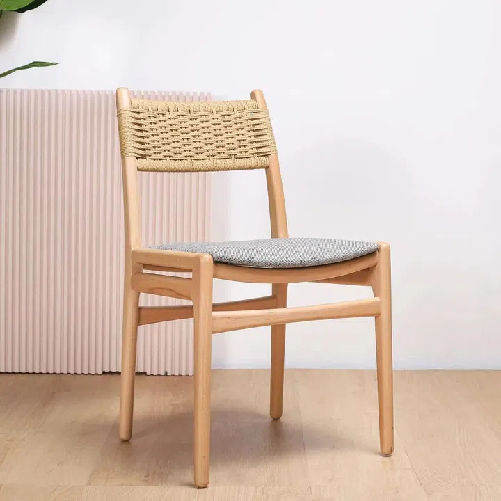 Built with natural German beech wood and an upholstered fabric seat, the key feature of the Zenith chair is its natural paper rope woven backrest that adds to the overall charm and allure. A must-have for any bohemian chic home.