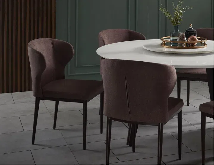 Fully cushioned and upholstered in a choice of velvet or fabric, Lydia dining chair is designed with a single-piece backrest that extends out to a pair of comfy armrests too. Its simple silhouette is added with a touch of sophistication where you will find the fabric piping running across at an angle.