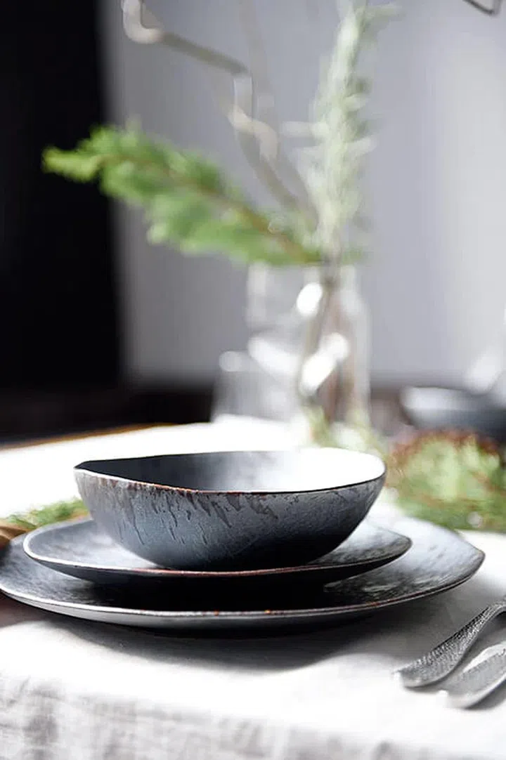 Beautifully and individually handcrafted by Thai artisans, the charcoal grill dinnerware set by Kra Sanctuary features a charming charcoal texture with an expressive splatter of rustic golden bronze colour, topped with an iridescent sheen finishing. As the name suggests, this set is created with the richness of smoky barbeque night vision in mind.