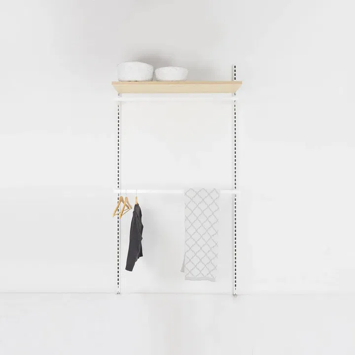 With the wall-mounted Sonja wardrobe, you will get a flexible and modular track system where you can adjust the positions of clothing rails and shelves freely to accommodate your storage requirements. The full Sonja series features 9 different configurations that you can mix and match to best install in your space.
