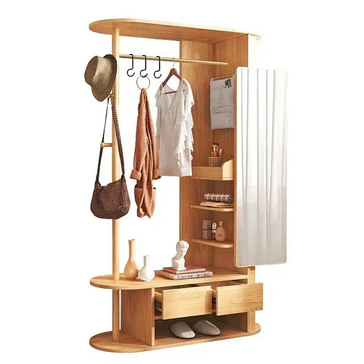 It is a chic all-in-one vanity dresser setup that seamlessly integrates a swing-out mirror, inner shelvings that are perfect for beauty products, 2 spacious bottom drawers to stow away any hot hair tools and accessories, as well as the clothing rail and knobs at the side for your bags and hats too! You can choose from the different wood tones of ashwood, walnut, and ebony to jazz up any vanity or entryway.