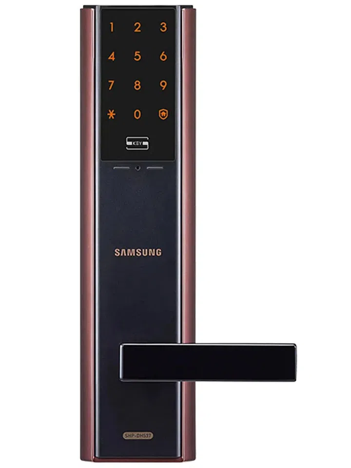 An advanced and stylish digital door lock with orange backlit LED touchpad, the Samsung SHP-DH537 is a winner of the iF Design Award and Red Dot Design Award.