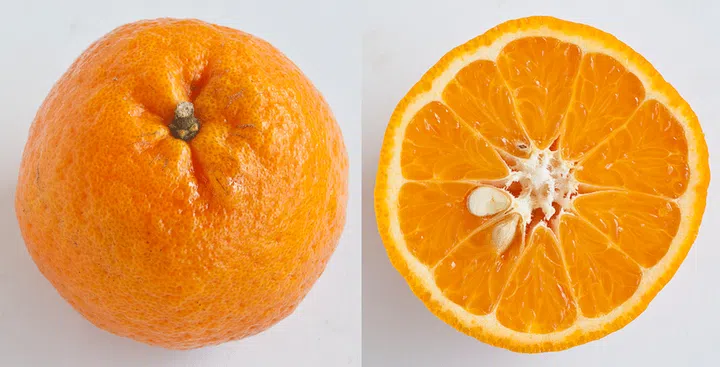 This mandarin-tangerine-pomelo cross from the United States is the size of a grapefruit, with thin, clingy yellow-green skin and lots of seeds.