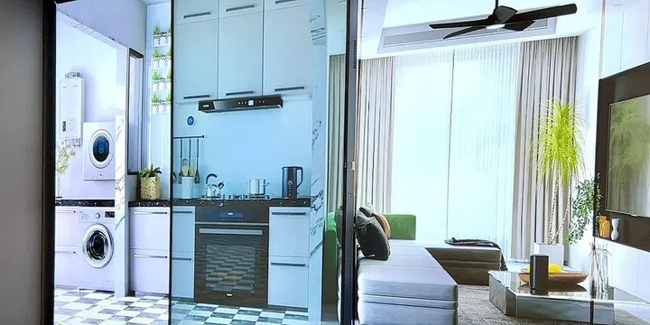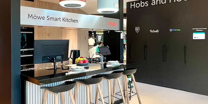 After you're done exploring the smart living room setup, enter the adjacent smart kitchen setup where you will find smart gas stoves, and kitchen hoods (connected to WiFi and will automatically turn on along with the stove).