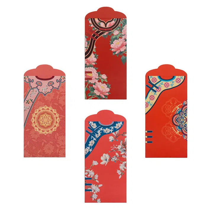 These angbaos feature cheongsam designs. They come in a pack of ten. Choose between four different cheongsam styles, from the blue scarf and floral patterns, to the pink and blue bird scarf, and leaf pattern background.