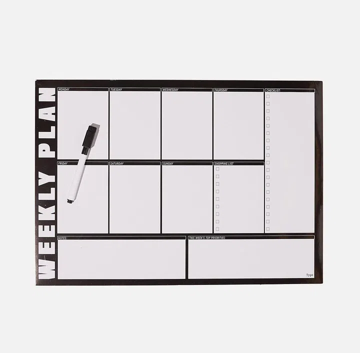 Map out your week with a reusable weekly planner. Get the satisfaction of ticking off your tasks once you’ve completed them and start a fresh each week with a clear list of things to do. This makes your day-to-day tasks much easier to follow and the magnetic design means you’ll find it easy to fix to metal surfaces like your fridge door.