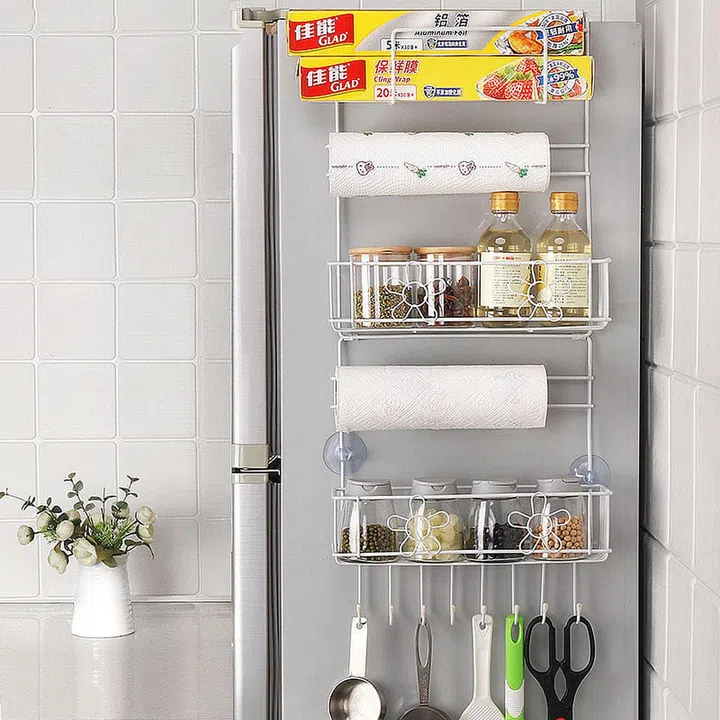 This storage system is perfect for smaller kitchens offering multiple ways to store extra kitchen essentials, from the kitchen roll rail, to easy access to hooks for scissors and other utensils. The four suction cup attachment offers strong adhesion, without risk of causing any damage to the fridge itself. It even has a spice rack for your favourite flavourings.