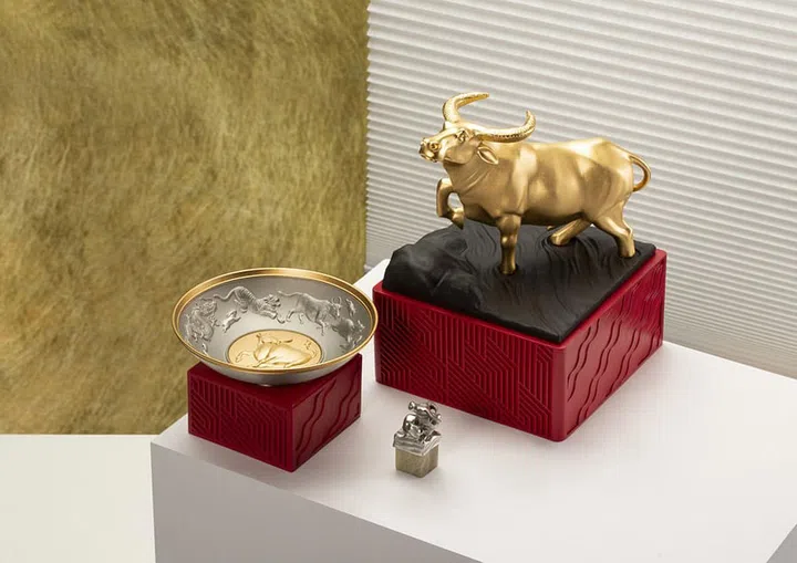 Royal Selangor's 2021 Year of the Ox Figurine shows the animal - which represents strength and power - crossing a riverbank, with abstract motifs of waves, rocks and clouds on a base of crimson bonded porcelain. It is sculpted in pewter and gilt with 24K gold.