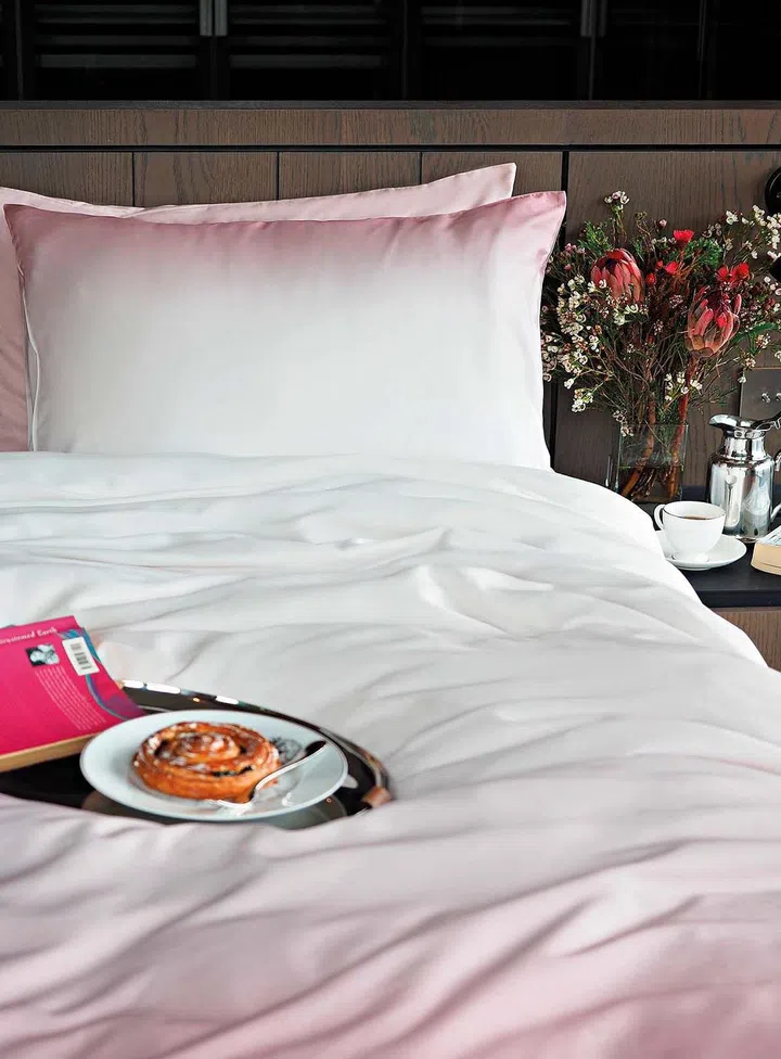 Inspired by the glowing rays of sunlight sparkling over a shimmering tide, the Hope Quilt Cover set by homegrown linen label Aevary charms with its delicate ombre efect digitally printed across the plush and buttery soft bamboo fabric.