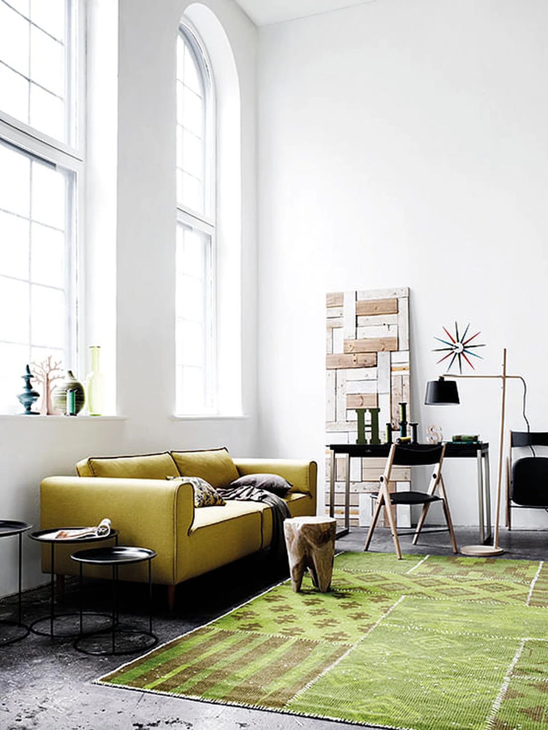1. On the wall: Because of its earthy look, moss green can end up looking dull when used as a base colour. To brighten up the space, pair it with white for contrast or a very light birch to bring out its yellow undertones. This makes the green look more lively.You can combine different shades of moss green, too — as seen in this living room set. Rug and sofa by Boconcept.